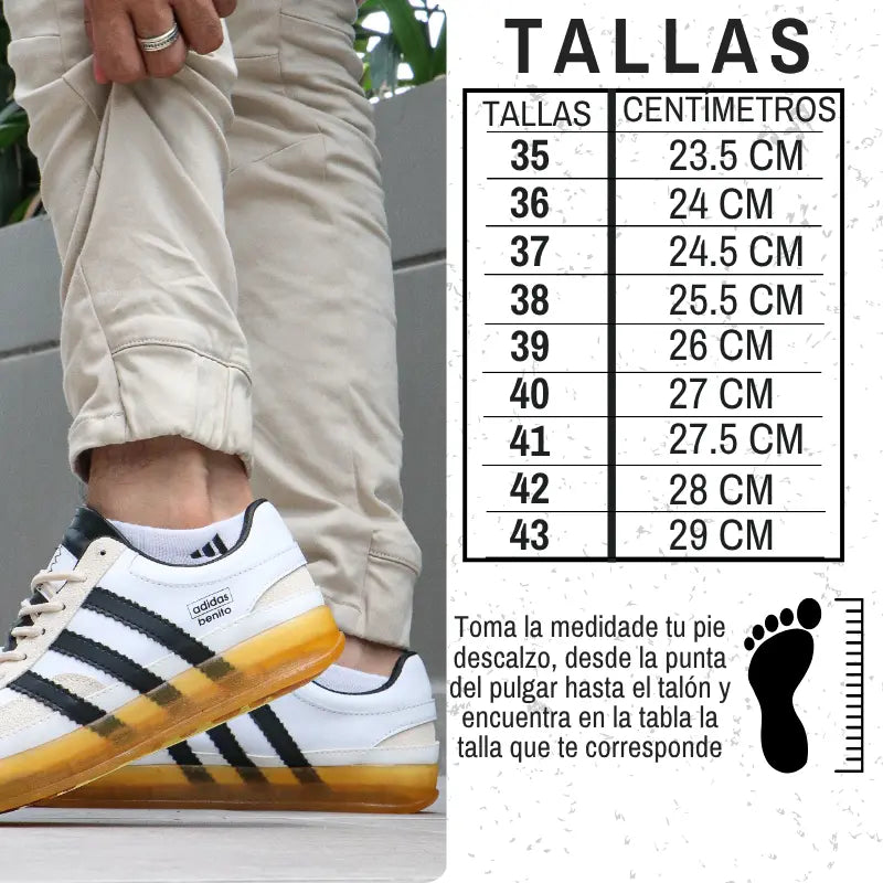 Toma la medida de tu pie descalzo, desde la punta del pulgar hasta el talón y encuentra en la tabla la talla que te corresponde pedir.